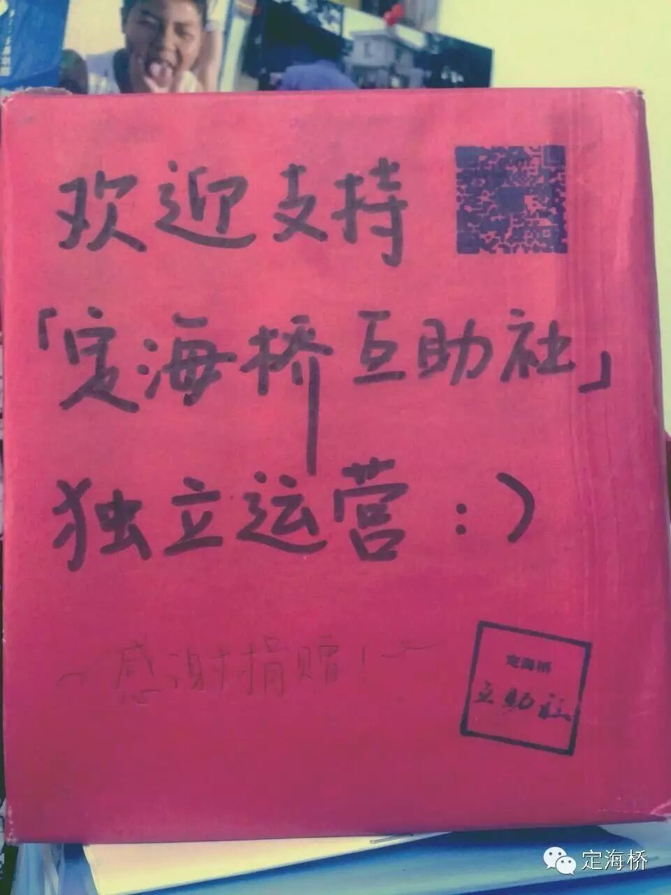 互助社发起人陈韵以个人资金赞助了成立之初3个季度的房租(每季度1.2万元),日常开销一部分来自PSA展览的剩余尾款,另一部分来自去年夏天开始的“定海谈”系列活动收到的来自众多朋友的茶水费捐助、以及通过购买《定海桥笔记》、“互助社特大号搪瓷杯”、定海桥明信片等实物的大力支持,以此撑过了羊年的夏秋冬三季。