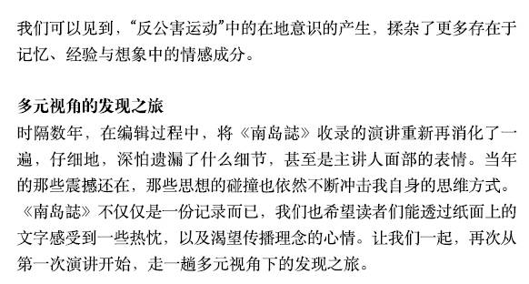 由新加坡南洋理工大学一群师生组成的南岛论坛,以“知识实践”为理念,冀开拓大学校园自由思考和讨论空间,散播思想启蒙的种子;与此同时,经由定期举办有关新马课题的讲座,建立起新马之间的知识连带与参照,至今已迈入第六年。两年前南岛向大众筹资出版经费,计划把过去的讲座纪录整理,今收录自2011-2013年的演讲录《南島誌》已於二月中旬顺利出版。